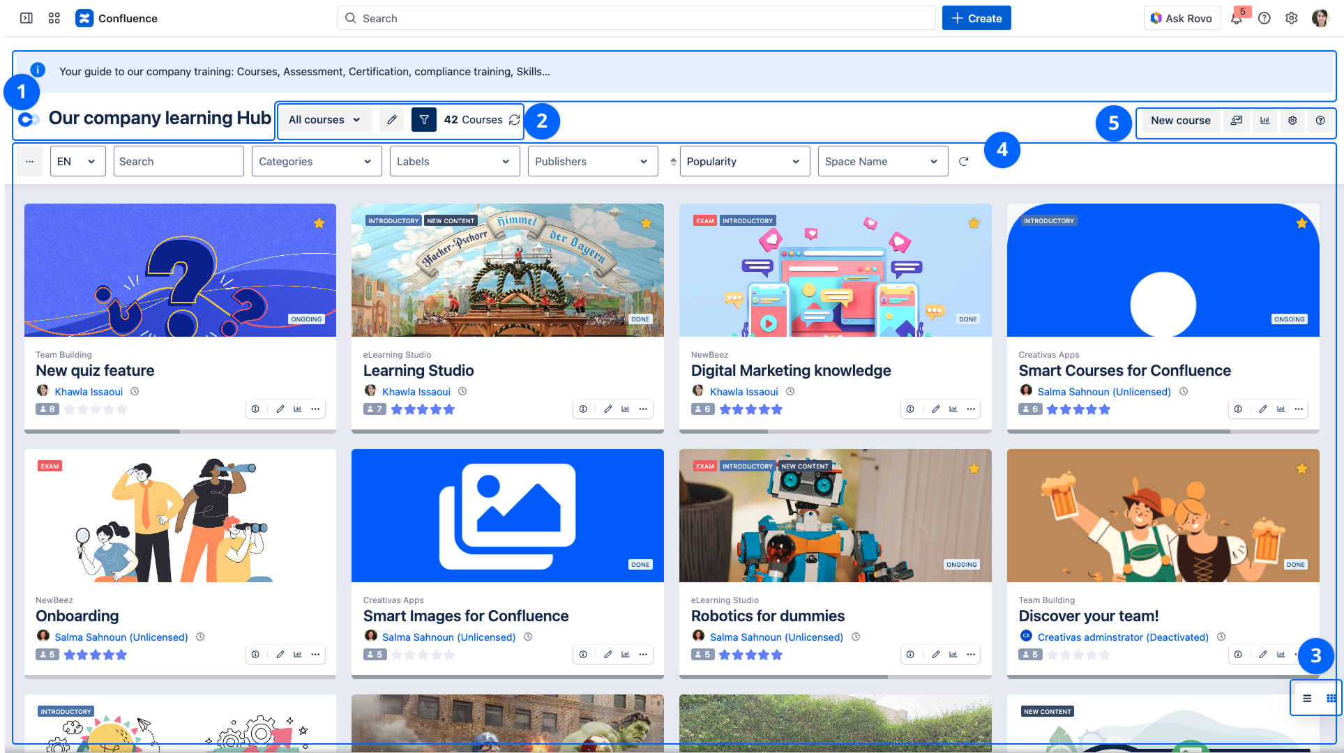CLOUD ONLY: You can access Courses from the Confluence menu bar under apps to get the global catalog overview which gathers courses made in different spaces.