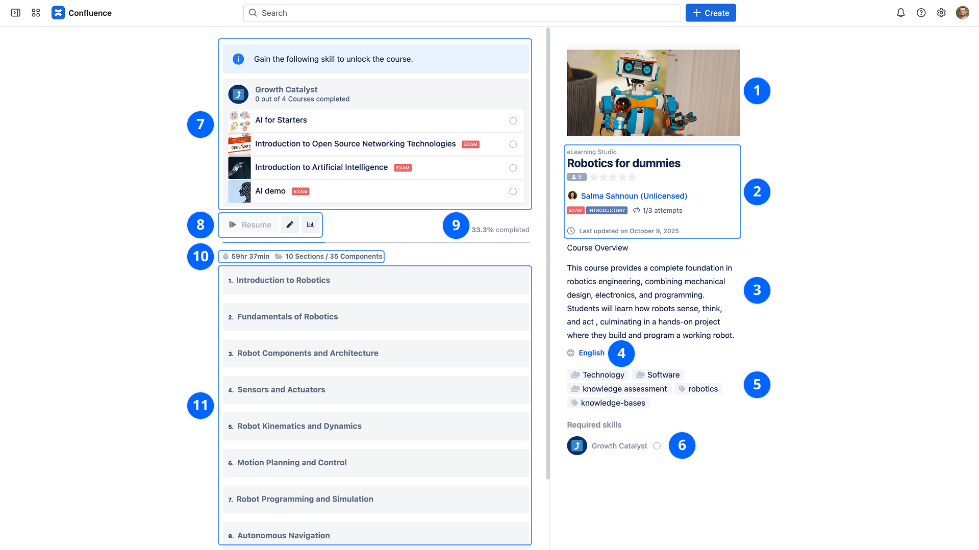 Smart Courses for Confluence Taking courses Current: Landing page Landing page Before jumping into the course player, learners can access the landing page and get an overview of the course.The landing page is opened when:Learner has not started the course yetLearner clicks on the course title or thumbnailThe landing page will display the following course information:Course ThumbnailCourse detailsSpace name: displays the course's target space. You can click on the space name to open the space catalog.Course titleNumber of learners: number of users who have attended the courseAverage ratings: the average learners' ratingsCourse creator's nameTags: displays the following tags when applicable: Exam, SCORM, Draft, Difficulty levelAttempts: number of exam attempts takenLast updated dateAbout this course: displays the course descriptionCourse languagesLabels and CategoriesRequired skills: list of skills that are required to access the courseCourse requirements and information: the following messages are displayed in the landing page when applicable:Exam start messageExam resume messageCourse overdueExpired sessionRequired skill not gainedActions:Open the course by clicking on the Start, Resume, Revisit or Preview buttonsCourse dashboardEditCourse insightsProgress bar: This bar displays the learner's session progress. For example, if the learner has already viewed half of the course components, this bar will be half-filled.Duration estimation and the number of sections and components in the courseTable of contents Hover over the Exam tag or the number of attempts to see the minimum pass score set for the exam ×