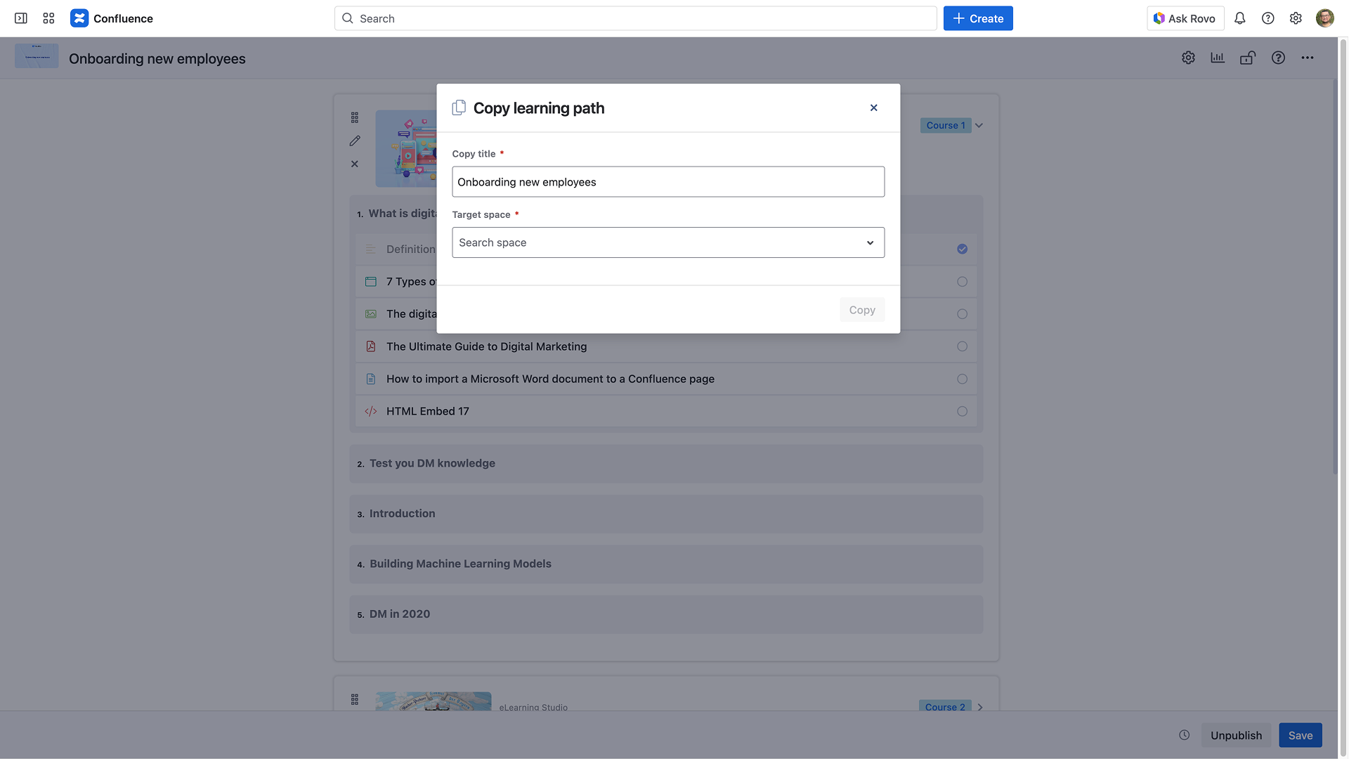 Note that it is only possible to copy a learning path to another space if the editor has creation rights.