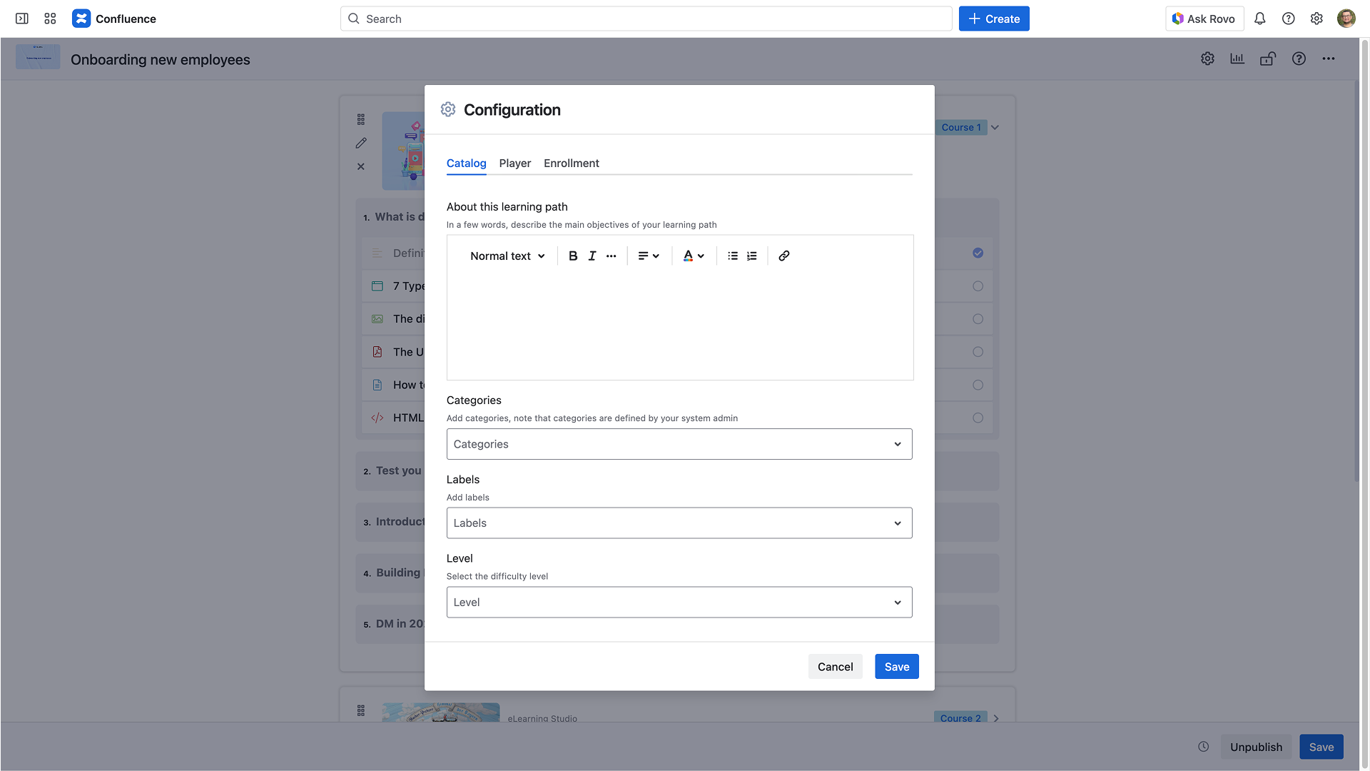 Select one or more labels; the labels are used in the catalog to filter learning paths. You can also use these labels in the Confluence search to find them. Check this link for more details about Confluence labels creation.