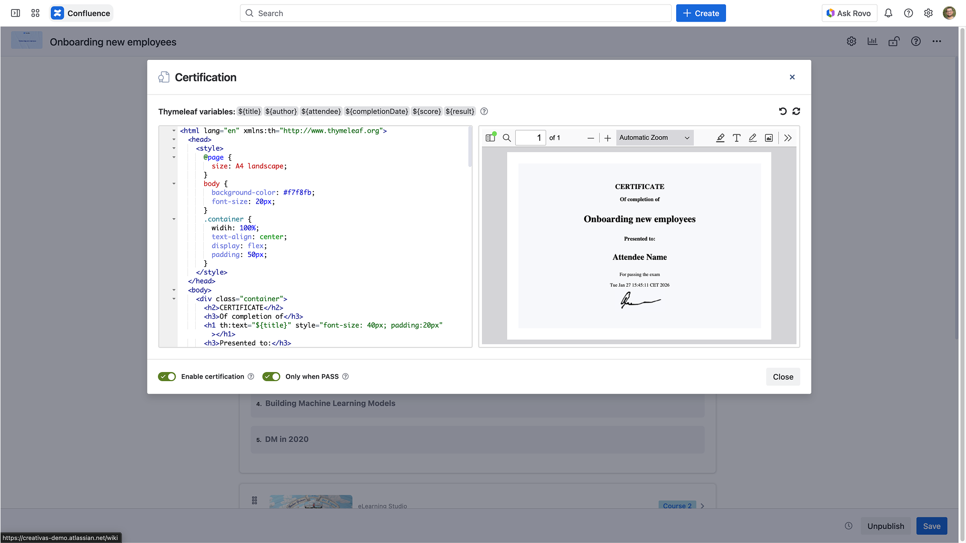 You can easily customize your certificate using a combination of HTML and Thymeleaf code while having a live preview of the changes you made.