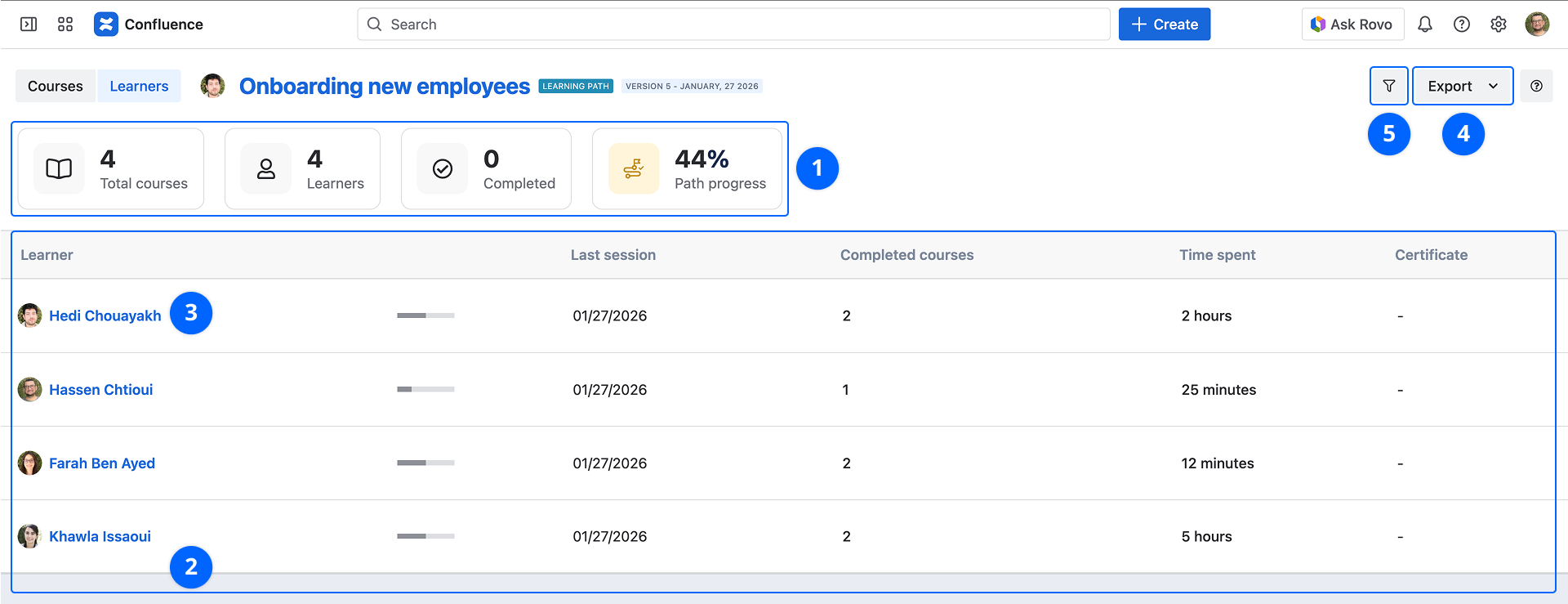 - Title: Course title with a link to the detailed insights of this course. A special indication is displayed next to the title if the course is an Exam or a Draft