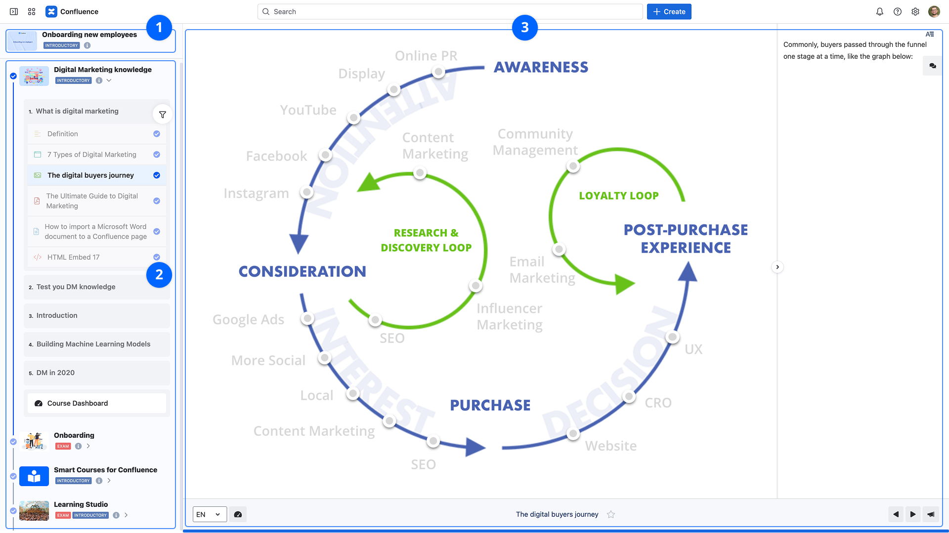 Smart Courses for Confluence Smart Courses player Learning Path player [Cloud] Current: Learning Path player overview [Cloud] Learning Path player overview [Cloud] 1. Learning path informationLearning path titleLearning path thumbnailDifficulty levelLearning path creator's nameThe number of courses in the learning pathThe learning path description2. Learning path sidebarThis section allows direct access to the learning path's courses. Each expanded course will contain its sections and components.Courses in the sidebar will look as follows:Selected course: If a course is selected, its right-side border is highlighted with a blue colorCompleted courses: If a course has already been completed, a blue checkmark is displayedInaccessible courses: If a course cannot be accessed, a lock or stop icon is displayed with a clarifying message Learners can move to the next course with the help of the keyboard shortcuts when the current course is completed. 3. Course playerThe course player added to the learning path behaves as it does outside the learning path. The player's features and configuration will match the course editor configuration. ×