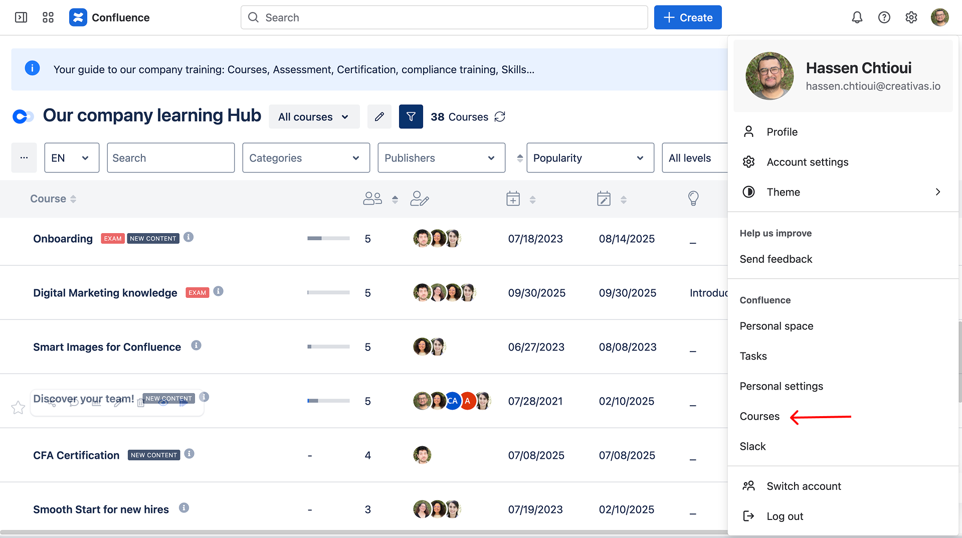 Smart Courses user dashboard can be accessed by navigating to User profile > Courses or by hovering on the username in course insights and user insights.