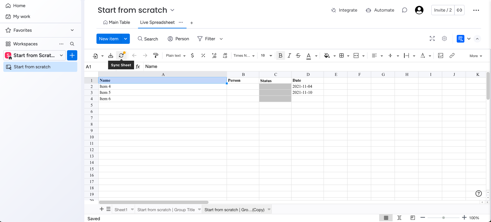 Any user allowed to sync the sheet can click on the Sync Sheet button to get the latest updates into the current spreadsheet. An orange dot on the sync button will appear when the imported group is updated on the board.