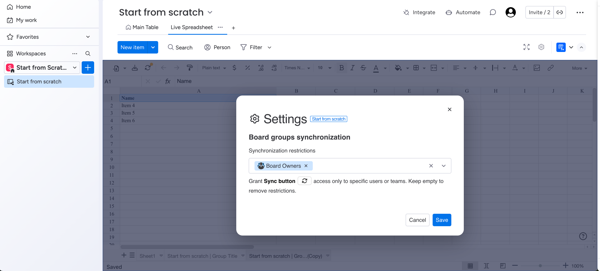Users can sync updates made to a board group after it was imported to Live Spreadsheets. They can only sync data that they are allowed to view in the monday.com board.